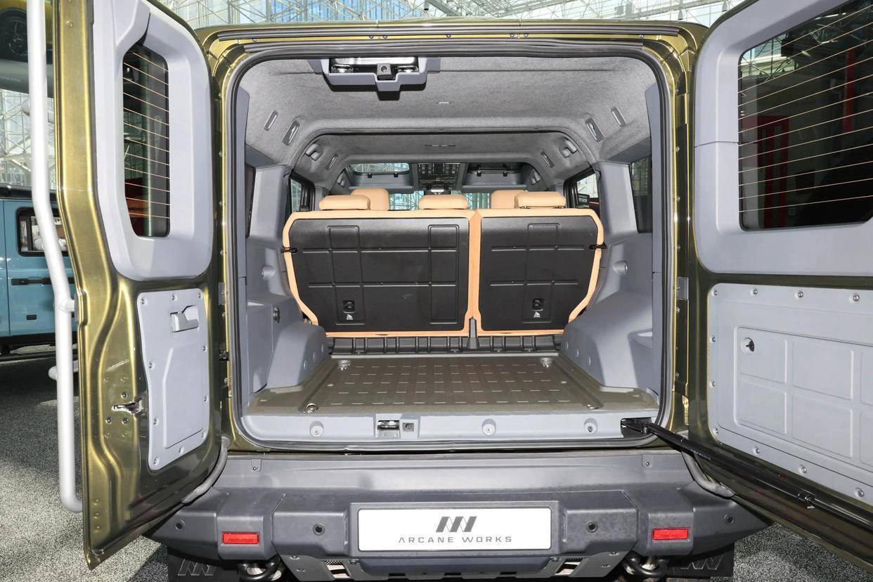 还有后备箱,英力士掷弹兵既不是掀开门,也不是平开门,而是采用了双开门,这在越野车中还是比较少见的,不过它的后备箱空间还算宽敞,容积可达1255L。