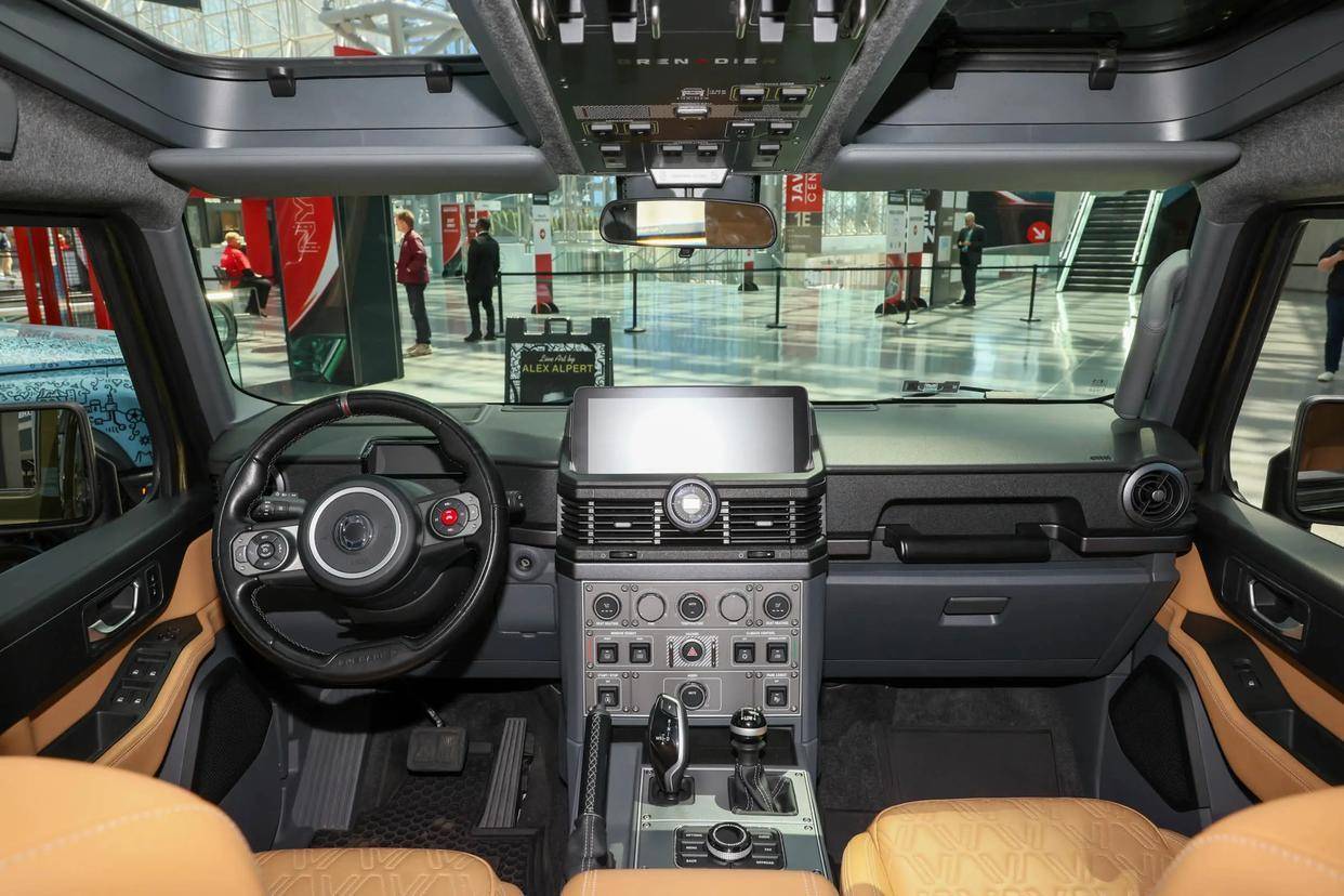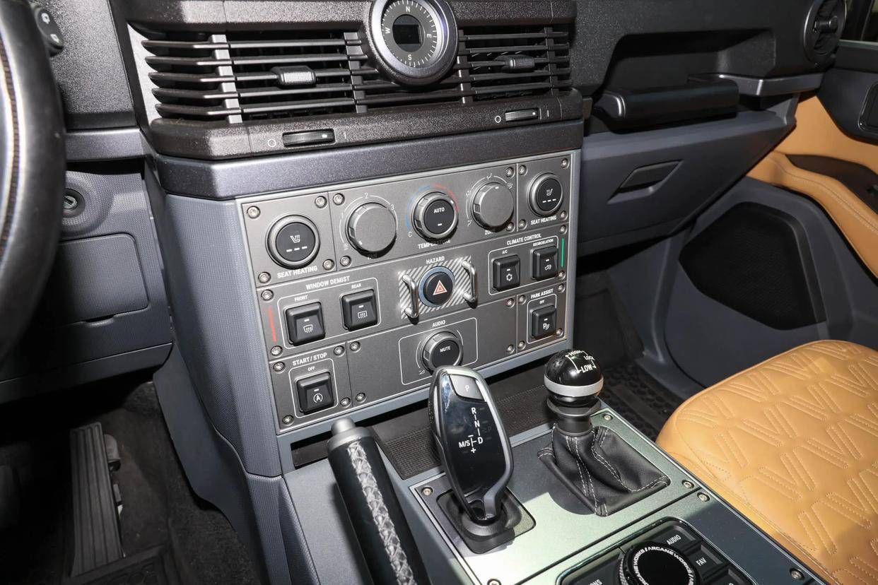 前排地台上,英力士掷弹兵配备了机械手刹、宝马的“大鸡腿”电子挡杆和分动挡等,显得十分硬派。